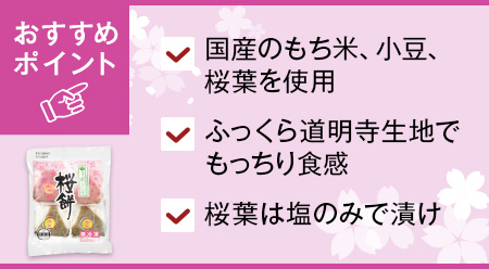 道明寺粉の生地で、北海道産小豆で作った程よい甘さの粒あんを包みました。桜葉は塩のみで漬け、ミョウバン、クエン酸は不使用です。