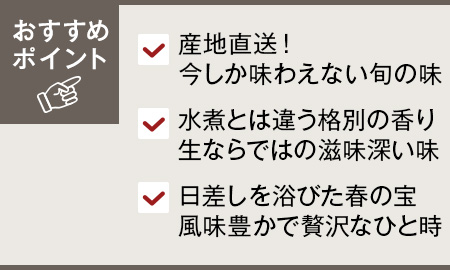 水煮では味わえない格別の風味!日差しを浴びて育った、滋味豊かな「生」の筍を旬のままお届け。