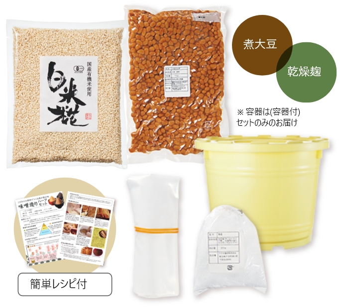 有機煮大豆1kg×1袋、有機白米麹500g×1袋、食塩200g×1袋、ビニール袋×1、輪ゴム×1、リーフレット、容器(上径21×下径15.5×高さ16㎝、ポリエチレン製 ※容器付きセットのみ)