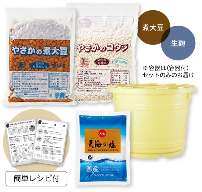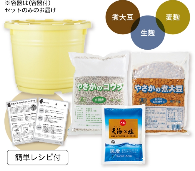 味噌用煮大豆(有機)1kg×1袋、やさかの白米こうじ(有機・生)800g×1袋、食塩(天海の塩)200g×1袋、リーフレット、容器(上径21×下径15.5×高さ16㎝、ポリエチレン製 ※容器付きセットのみ)