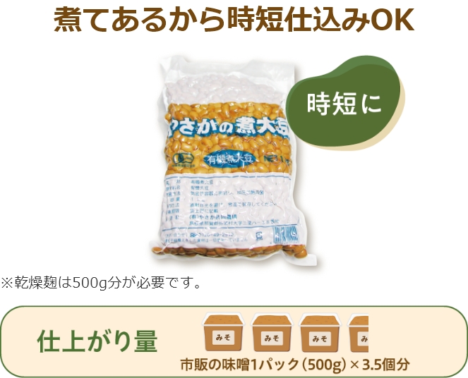 有機煮大豆1kg×2袋、有機白米麹500g×2袋、食塩200g×2袋、ビニール袋×1、輪ゴム×1、リーフレット