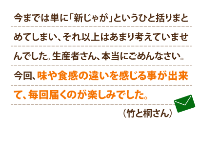 今までは単に「新じゃが」というひと括りまとめてしまい、それ以上はあまり考えていませんでした。生産者さん、本当にごめんなさい。今回、味や食感の違いを感じる事が出来て、毎回届くのが楽しみでした。天候が原因で欠品が続き、その点はとても残念でしたが、来年も頒布会が継続されたら、必ず購入したいです。