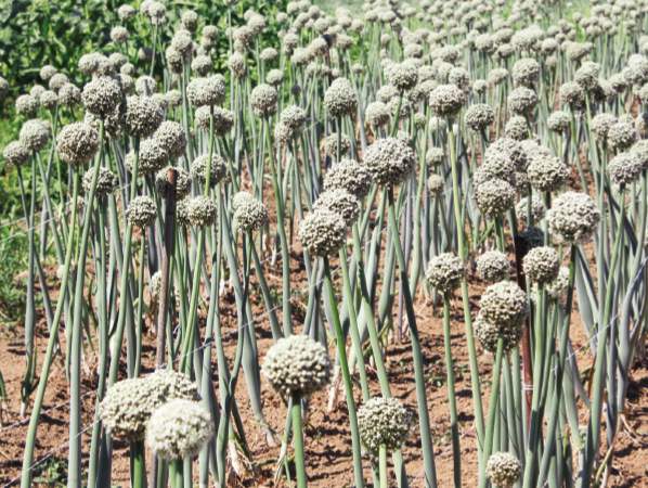 種採り用に栽培している「札幌黄」。ねぎの頭に咲く白い小さな花が、いずれ玉ねぎの種になります。