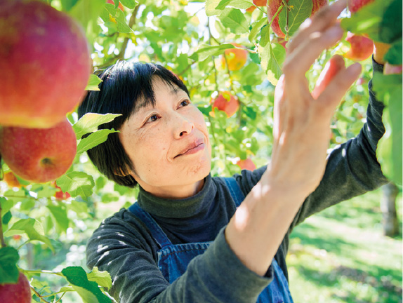 原明子さん(写真右):俊朗さんの兄、故・志朗さんのおつれあい。志朗さんから引き継いだりんご栽培に奮闘中