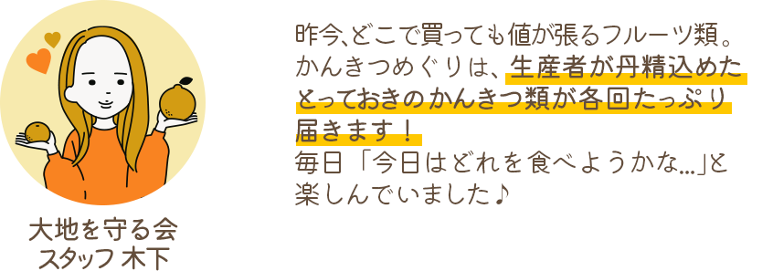 【生産者】無茶々園/愛媛県、肥薩自然農業グループ/熊本県、無茶々園/愛媛県、ブレス/熊本県、他 【農】減