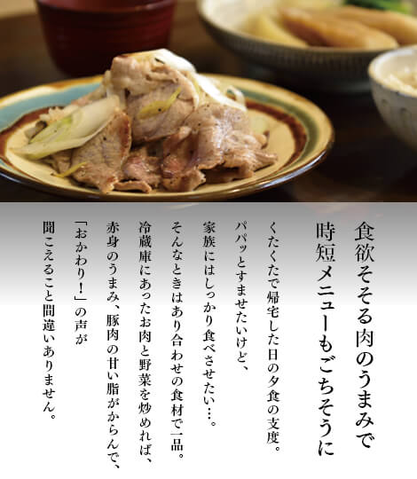 豚丼、ゴーヤーチャンプルー、カレーライス、エノキや人参の千切りに巻き付けて甘辛く焼いてお弁当のおかずにも。
