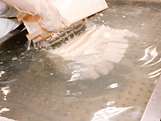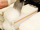 にがりを加えて固めたら、冷水にさらし、エグみを取った後に包装します。