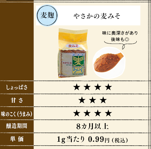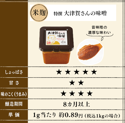 塩っぱすぎず、コクとうまみがしっかりある。大地や他のナチュラル系でいろいろと味噌を試してきましたが、これが一番。今後もリピートします。