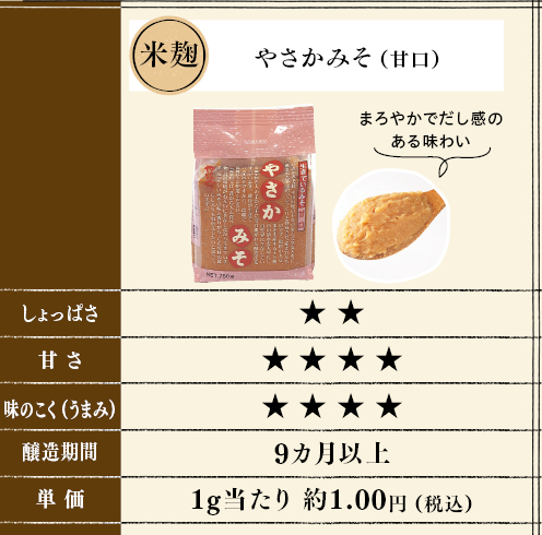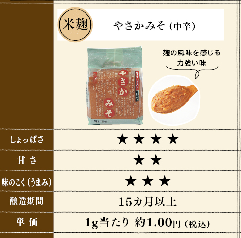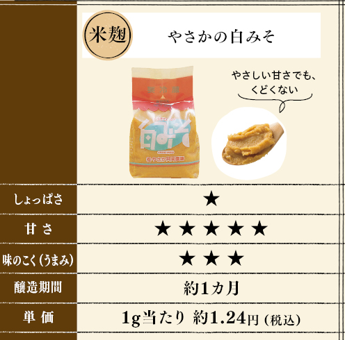あっさりタイプで塩分控えめの味噌です。国産大豆を使用し、9カ月以上熟成させました。「やさかみそ(中辛)」と比べてマイルドな味わいです。