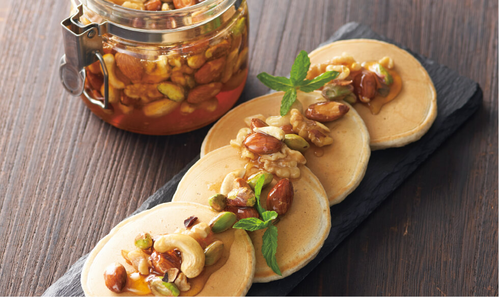 ハニーナッツはパンケーキとも好相性です。九州産の素材にこだわった、ふわもち食感のパンケーキにハニーナッツがアクセントになり、手の止まらないおいしさ。バニラアイスクリームをトッピングするのもおすすめです。