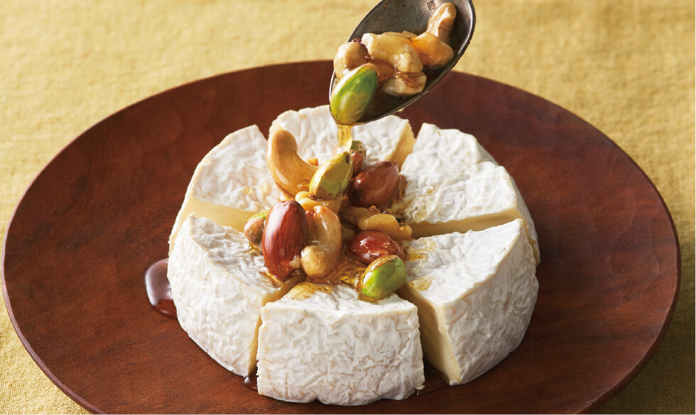 カットしたカマンベールチーズの上にハニーナッツをトッピングすれば、おしゃれなおつまみのでき上がりです。カマンベールチーズの塩味とハニーナッツの甘みがとけ合ってくせになる味わい。