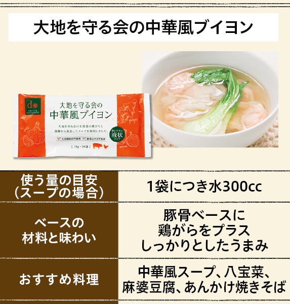 ポークとチキンのエキスをベースに、ごま油などで風味付けした中華風ブイヨン。素材のうまみを生かした化学調味料不使用で、手軽に中華の味付けが決まります。