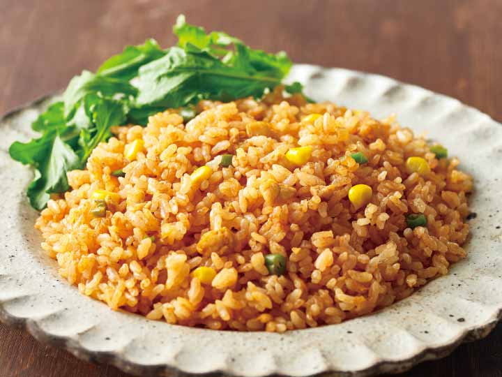 国産のお米を直火で炊き上げ、国産野菜と国産の鶏肉、トマトケチャップでチキンライスに仕上げました。