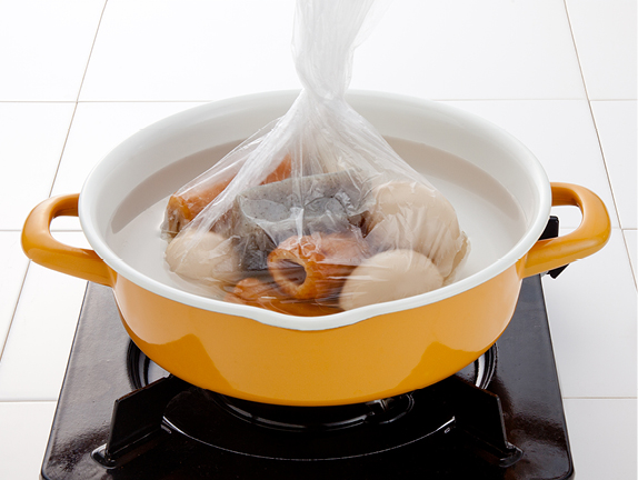 鶏モモ肉や野菜を食材ごとに袋分けし、軽く口をしばって火がとおるまでしばらくお湯の中でふつふつさせるとおいしい蒸し料理ができました。一気に何種類もできるので便利ですし、袋に溜まったスープがまた美味!