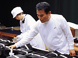 海苔の等級検査の様子。「厚み、弾力、やわらかさ、キメの細かさ……。すべてさわった感じでわかるんだ」とは、検査員の平河豊彦さん。