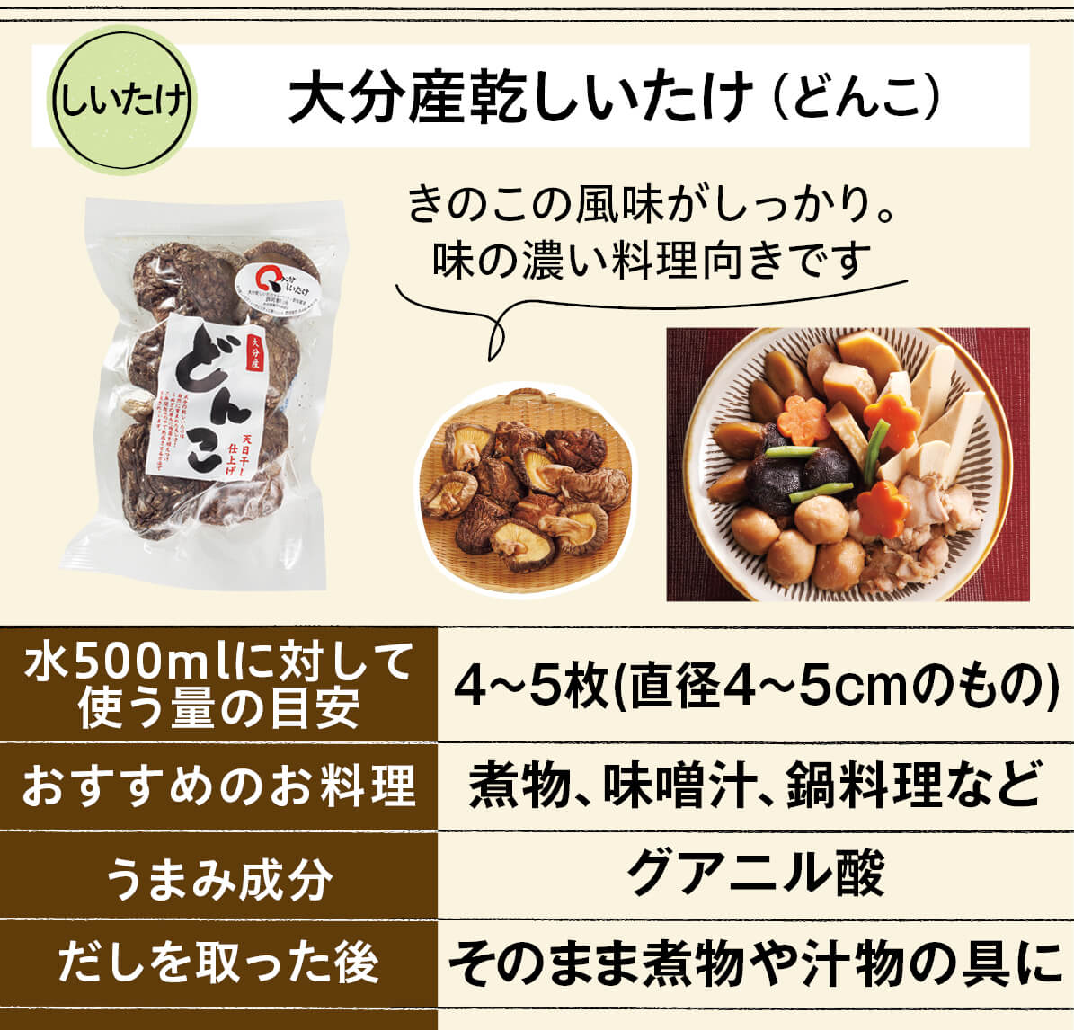 干ししいたけがしっかりと水に浸る容器に入れ、12~24時間ほど冷蔵庫で水出しをします。カツオや昆布など、他のだしと合わせることでうまみの相乗効果が得られます。