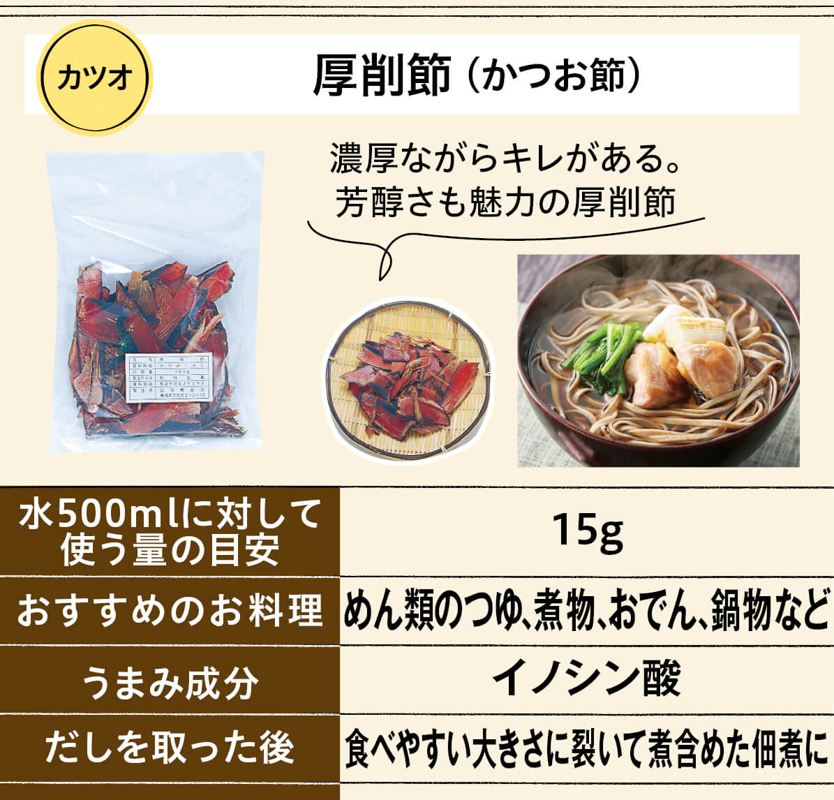 水から厚削節を入れて強火で沸騰させ、沸騰したら弱火にしてアクを取りながら8分程度煮出します。手作りそばつゆなど、濃い味付けに負けないうまみと香りのだしになります。
