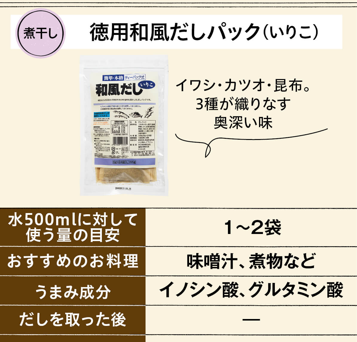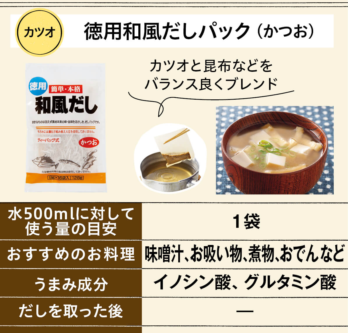 水からパックごと入れて中火で沸騰させ、沸騰したら弱火で5 ~6分煮出します。カツオと昆布に加え熟成もろみも入っているため、バランス良く本格的な香り高いだしが楽しめます。