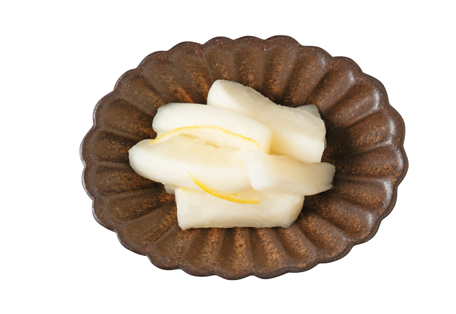 有機砂糖を使って漬けた大根に、国産有機栽培のレモンピールの香りと風味がアクセント。