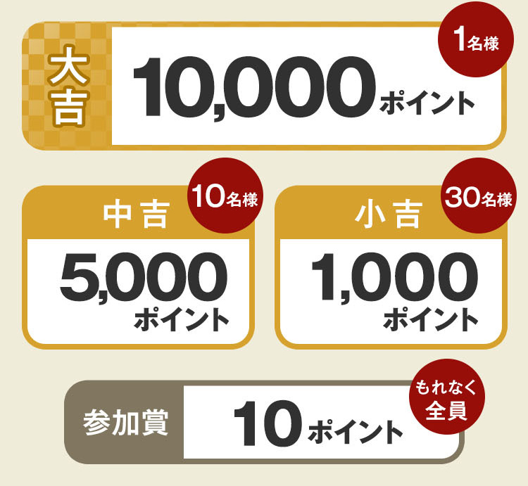 10,000、5,000、1,000ポイントは、抽選でプレゼントいたします。参加条件は下記をご確認ください。