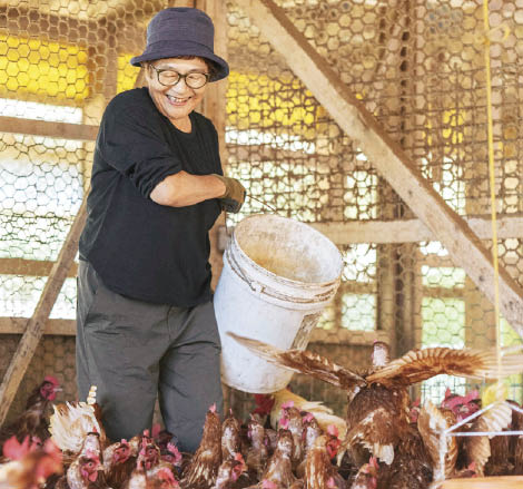 森の農楽舎の中田千歳さん(佐賀県佐賀市)。鶏の健康は卵の殻に現れるそう。与える飼料が鶏にも卵にも直結します。