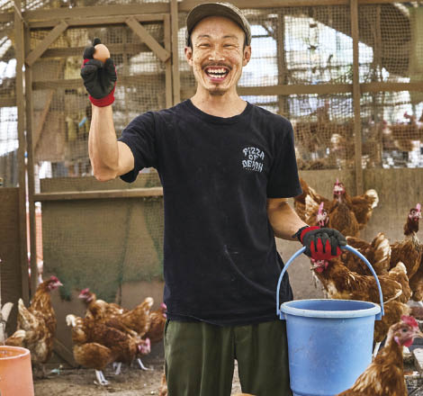 長野県富士見町の卵の生産者フジタファームでは、国産米の米粉と米ぬかを100%使用した飼料を与えています。「うちの鶏はお米を食べて育ってるから白っぽいんですよ」と代表の佐野洋介さん。お米育ちの卵は、普通よりも淡いレモンイエローの黄身が特徴です。