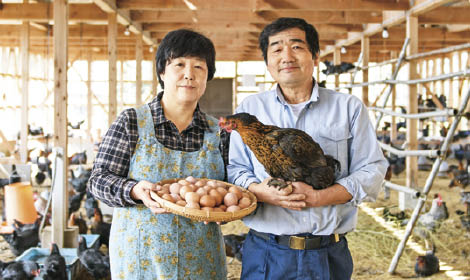広々とした鶏舎などで、自由に動き回って育った鶏が産んだ「平飼卵」は、味の良さやアニマルウェルフェア(動物福祉)の観点から、近年一般市場での取り扱いも広がっています。大地を守る会では1987年に、他に先駆けて取り扱う卵をすべて平飼卵に変更しました。さらに一歩踏み込み、飼料の自給にも挑戦。一般的な飼料の大半が輸入穀物を占めるなか、大地を守る会では、国産穀物による畜産を試み、短角牛、豚に続いて平飼養鶏もと、2000年から平飼卵を産む鶏の飼料を国産のものにする取り組みを開始しました。自主調達・自家配合した100%国産飼料の平飼卵は、全国的にも珍しいものとなっています。