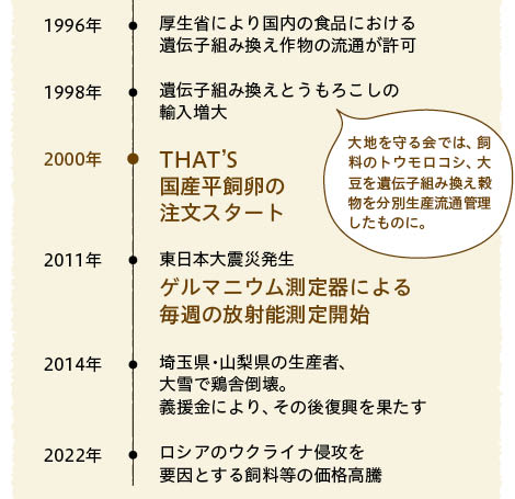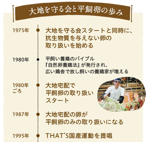 大地を守る会のなかでも長い歴史を持つ商品の一つが、卵です。今でこそ「平飼卵」は多く見かけるようになりましたが、大地を守る会が平飼卵の取り扱いを始めた1980年当時は、大規模でウインドレス鶏舎、段式、1ケージに複数羽での生産が主流になりつつありました。鶏の健康こそが卵のおいしさにつながると、いち早く取り組んだ歴史を振り返ります。